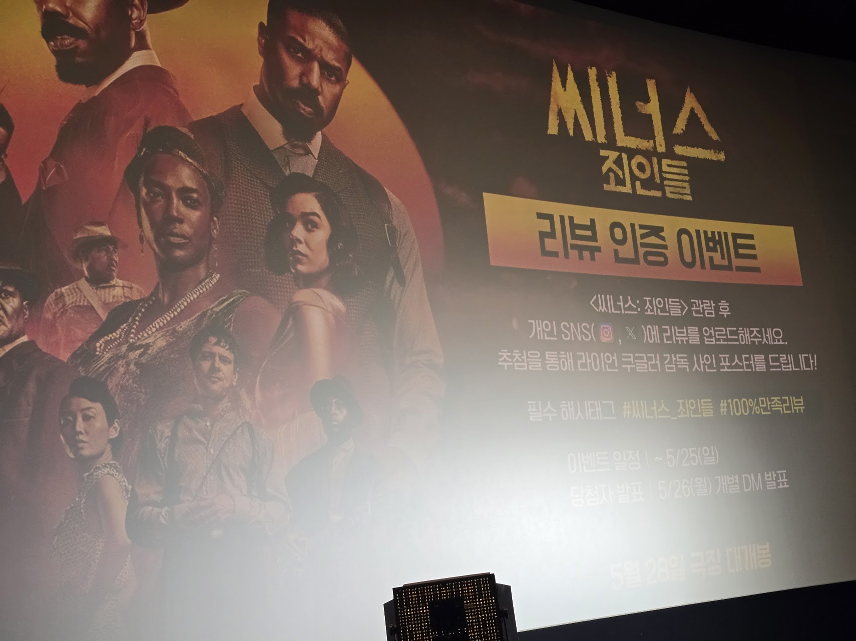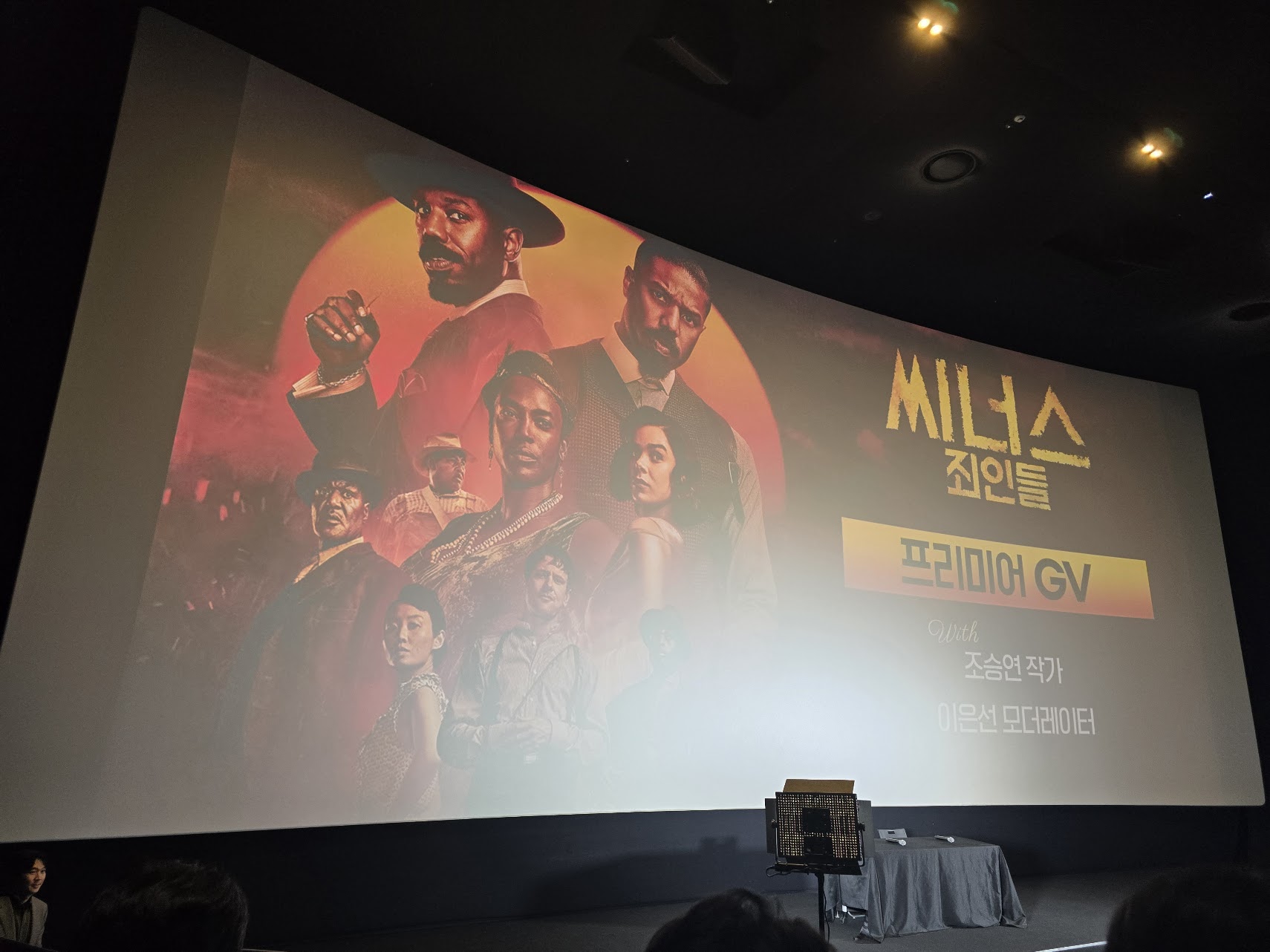 '씨너스: 죄인들'이 5월 28일 국내 정식 개봉 전 23일 금요일 메가박스 코엑스 돌비시네마관에서 시사회를 가졌어요! 시사회는 다소 이른 오후 7시 부터 시작했는데 상영 후 GV까지 준비해서 일부러 일찍 시작했던 것 같아요 - GV도 1시간 가량 진행해서 끝난 시간은 거의 10시 반이 다 되었습니다.