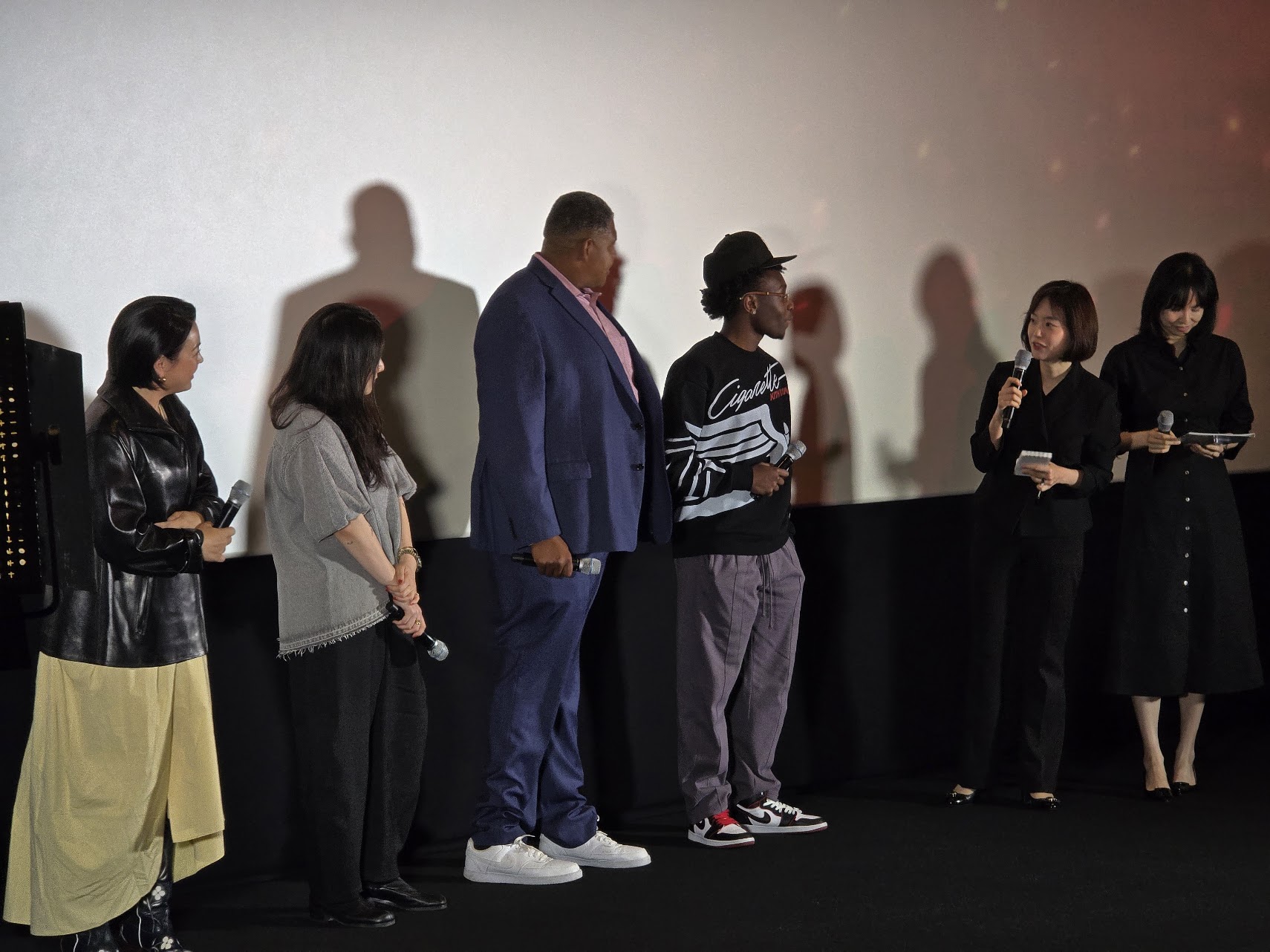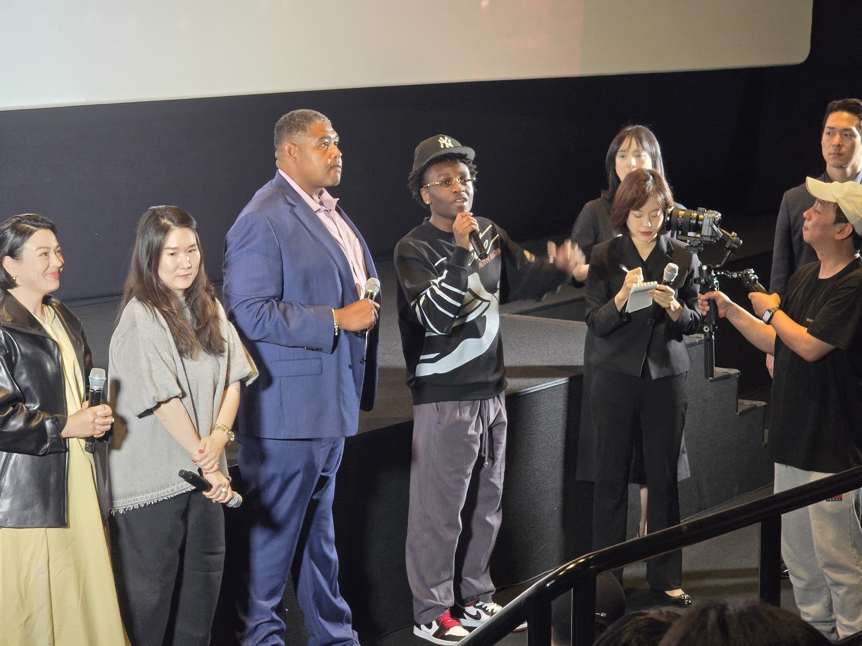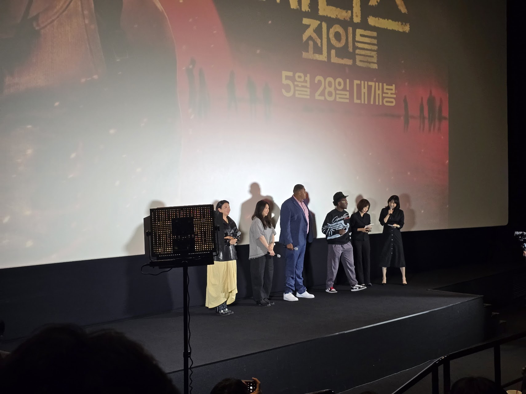 영화 관련 스태프들의 깜짝 방문 내한인사라 조금 놀랐는데, 주연 급 마일스 케이턴 배우분과 조연이긴 하지만 인터넷 밈으로 매우 유명한 ㅎㅎ 오마 밀러 배우 두 분이 참여하셨고 (리 준 리 배우님은 아쉽게도 이번 시사에는 불참하셨어요;ㅁ; ), 제작관련 총괄 프로듀서이신 레베카 조님, 총괄 음악 프로듀서이신 세레나 고란손님 이렇게 네 분이 참관하신 무대인사였어요!